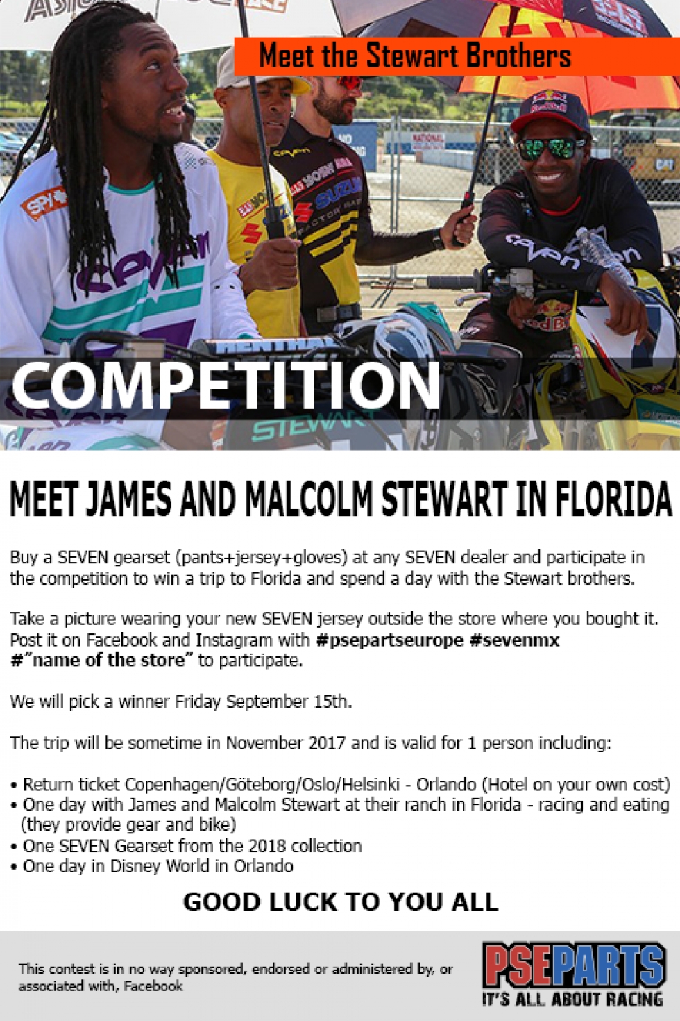Ota kuva ostamasi SEVEN:n ajopaita päällä liikkeen edessä. Lataa se kuva Facebookiin ja Instagramiin lisäten mukaan: #psepartseurope #sevenmx #seteamfi ja olet mukana kisassa.